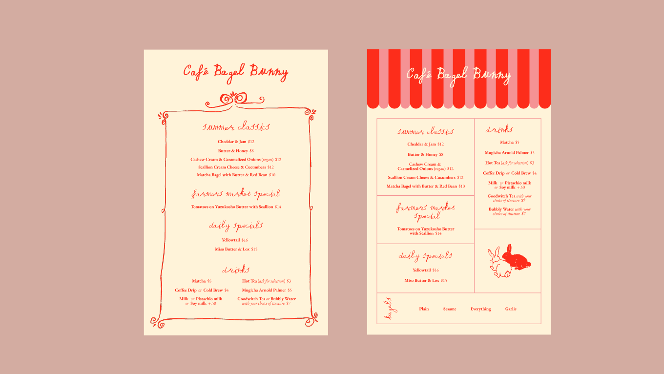 As Bagel Bunny expanded from pop-up events into retailers and bakeries, they needed a brand identity that could hold its own on a shelf. Distinctive enough to stop someone who'd never heard of them. The foundation was already there: original illustrations by founder Nori Smith that were playful, warm, and totally their own. Our job was to build a complete system around them.