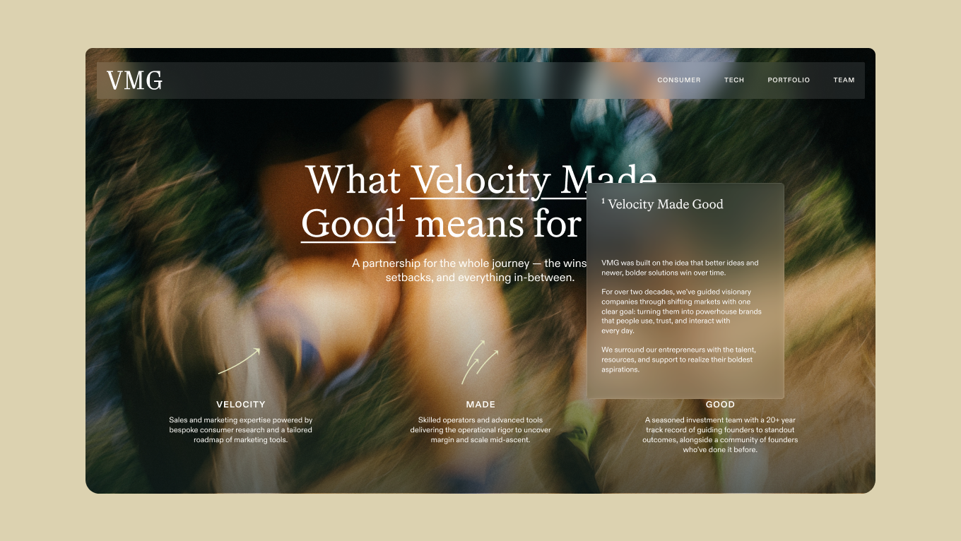 We built the aesthetic around controlled momentum: subdued earth tones and soft blurs grounding the textures and animations that convey motion. The result: a 200+ page site that matches the scale of VMG's impact and presents the firm the way it deserves to be seen.